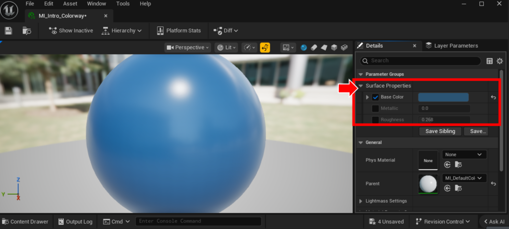 マテリアルの編集は編集モードに戻って青いボールを選択し、Detailsでマテリアルをダブルクリックすることで開けます。