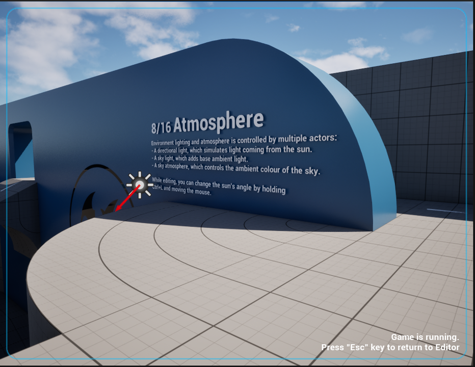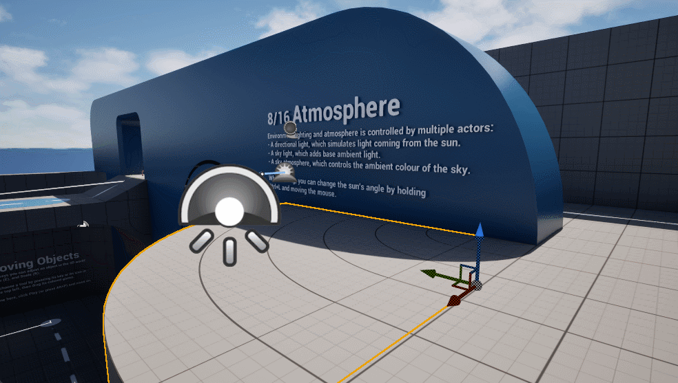 8/16 大気 環境光と大気は複数のアクターで制御されます: 編集中は、Ctrl+Lを押しながらマウスを動かすことで太陽の角度を変更できます。 |