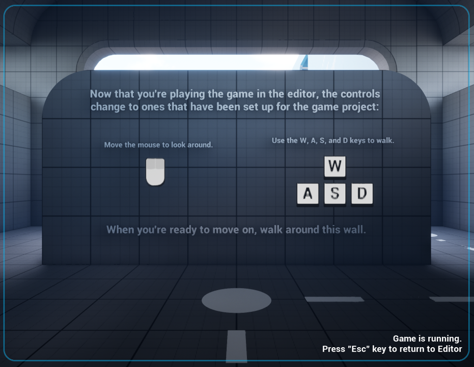 Now that you’re playing the game in the editor, the controls Move the mouse to look around. Use the W, A, S, and D keys to walk. When you’re ready to move on, walk around this wall. |