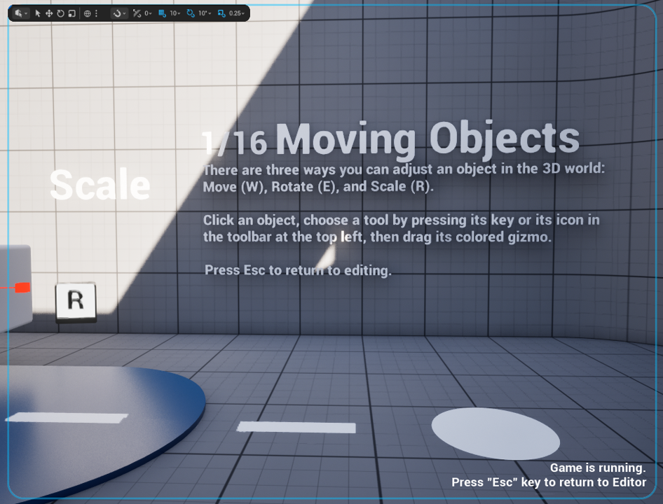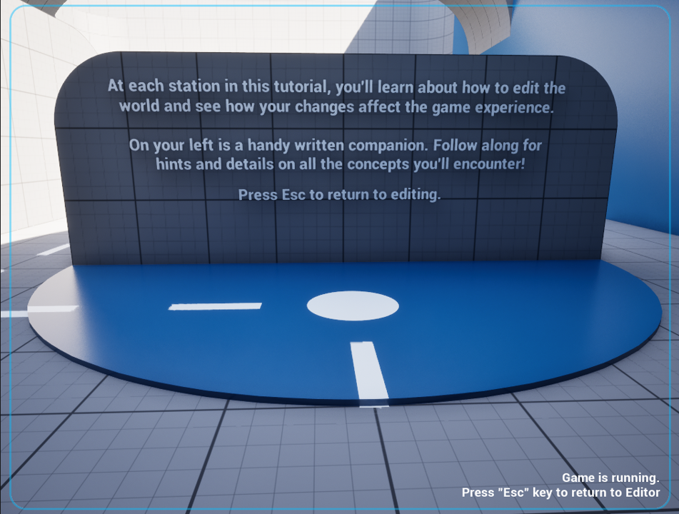 このチュートリアルの各ステーションでは、ワールドの編集方法と、変更がゲーム体験に与える影響を学びます。 左側には便利な解説ガイドが表示されています。遭遇する全ての概念に関するヒントや詳細を確認しながら進めてください! 編集画面に戻るにはEscキーを押してください。 |