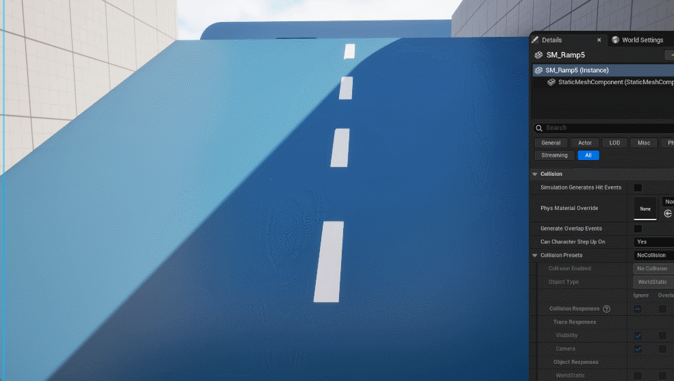 編集モードに戻って坂のMeshを選択してコリジョンの設定をBlockAllにしましょう。