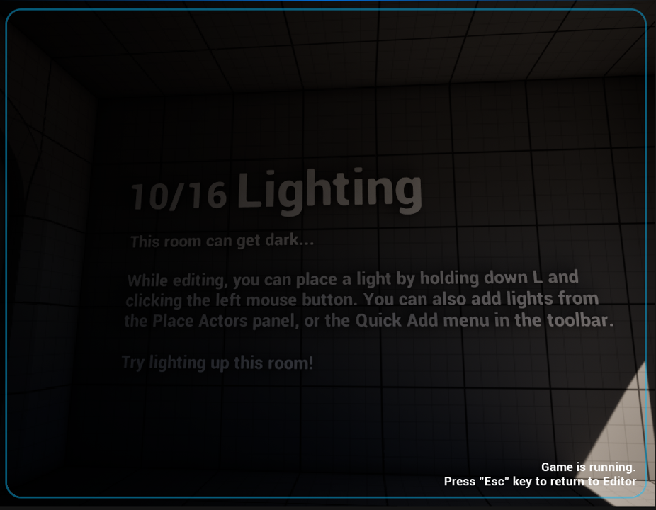 10/16 照明 この部屋は暗くなることがあります… 編集中に、Lキーを押しながらマウスの左ボタンをクリックするとライトを配置できます。また、[Place Actors]パネルやツールバーの[Quick Add]メニューからもライトを追加できます。 この部屋を照らしてみてください! |