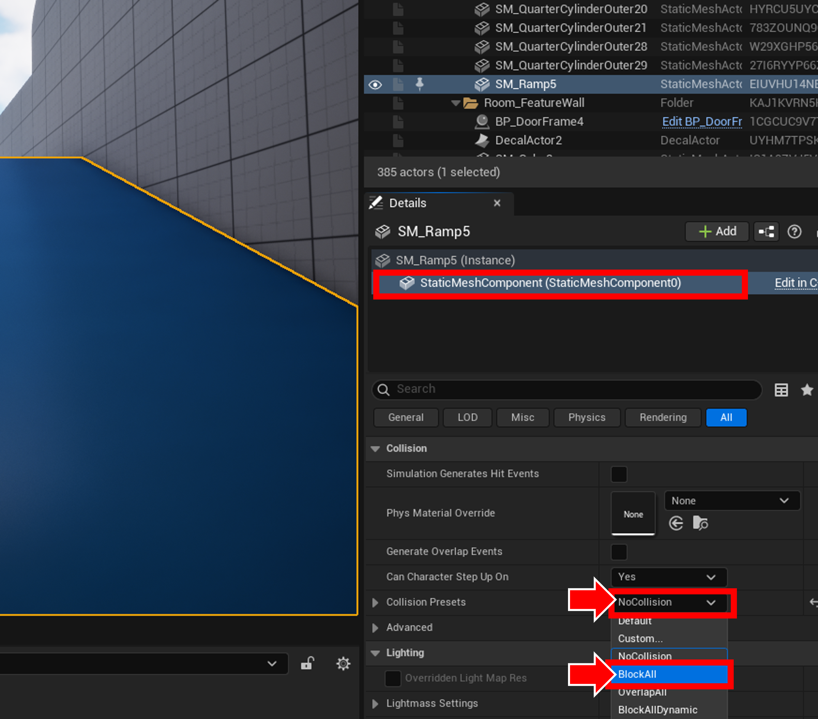 編集モードに戻って坂のMeshを選択してコリジョンの設定をBlockAllにしましょう。
