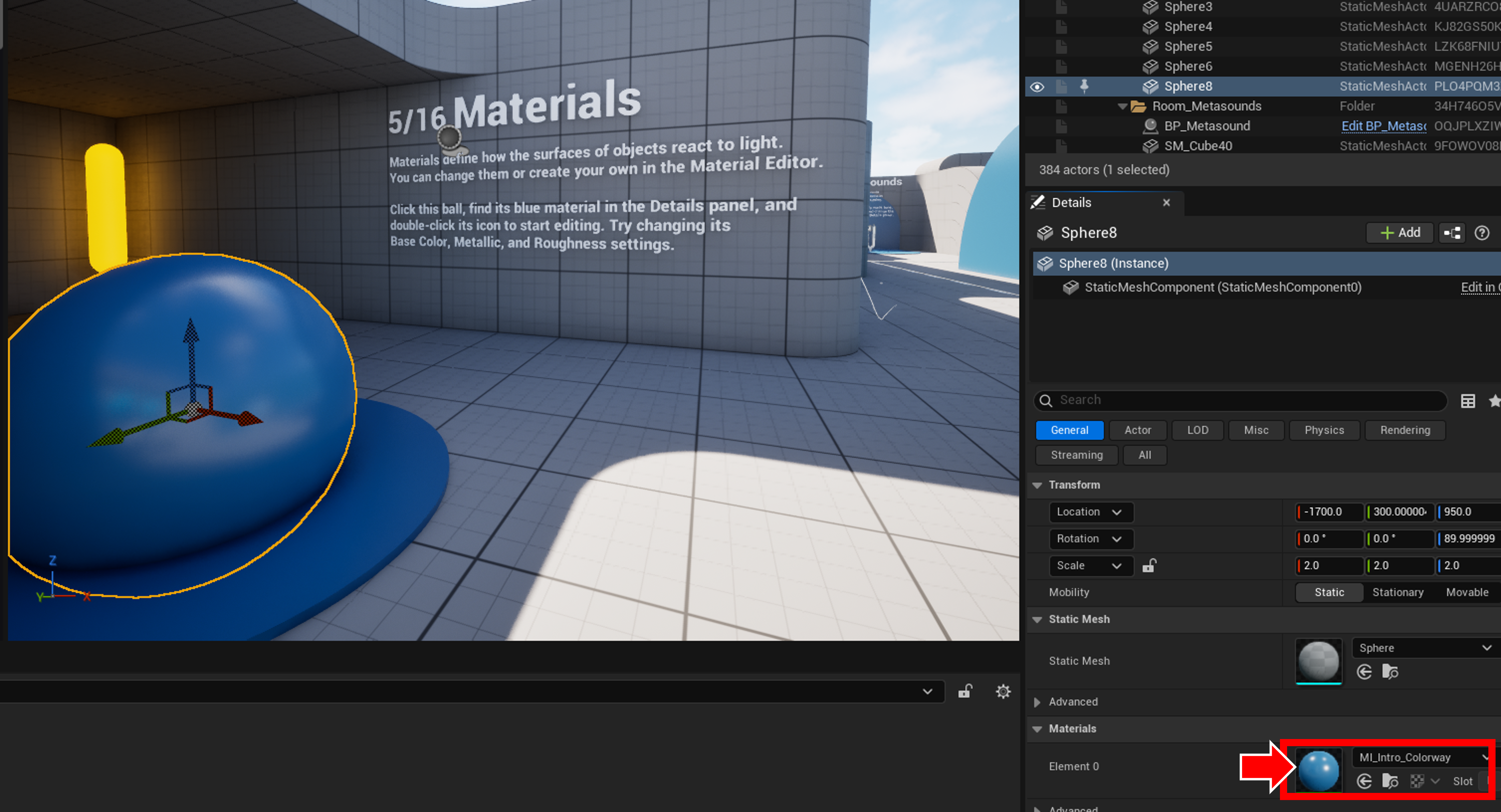 5/16 Materials Materials define how the surfaces of objects react to light. Click this ball, find its blue material in the Details panel, and |